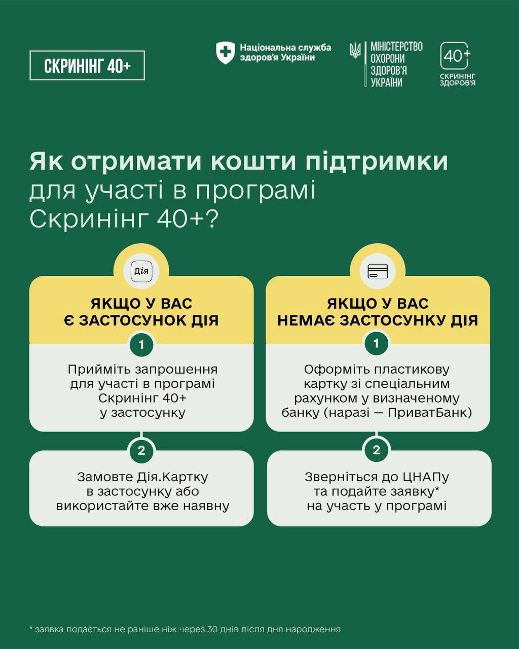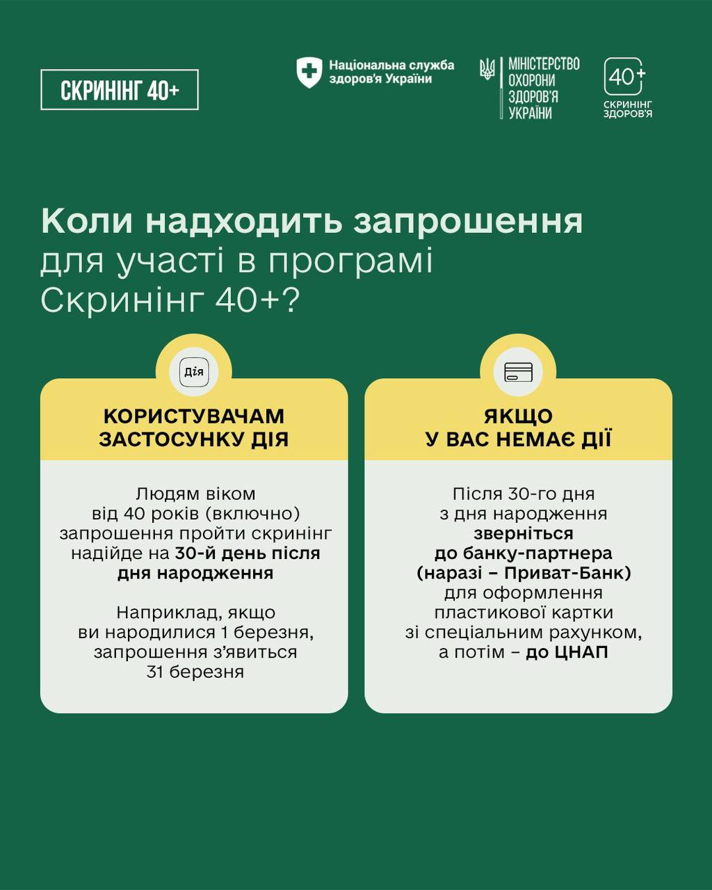 1️⃣ Запрошення на скринінг надходитиме в застосунок Дія на 30-й день після дня народження — для людей віком від 40 років і більше.