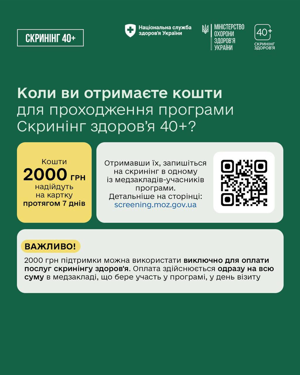 Детальну інформацію про програму Скринінг здоров’я 40+ та відповіді на найпоширеніші запитання знайдете за посиланням: screening.moz.gov.ua